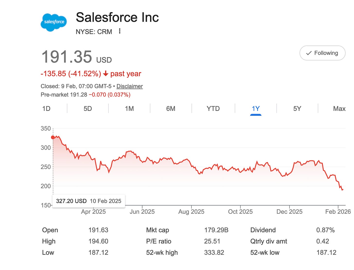 I’ve been watching Salesforce for years, but it was always priced like the market assumed everything would go right, and I wasn’t willing to play that game. What changed is not just Salesforce, it’s the whole software tape. SaaS valuations have been resetting across the board, and AI made it worse because investors are repricing both “AI SaaS” and “non-AI SaaS” at the same time, mostly out of uncertainty, so prices are moving first and narratives are catching up later. That creates a lot of noise, and it’s easy to confuse a multiple compression cycle with a real business problem