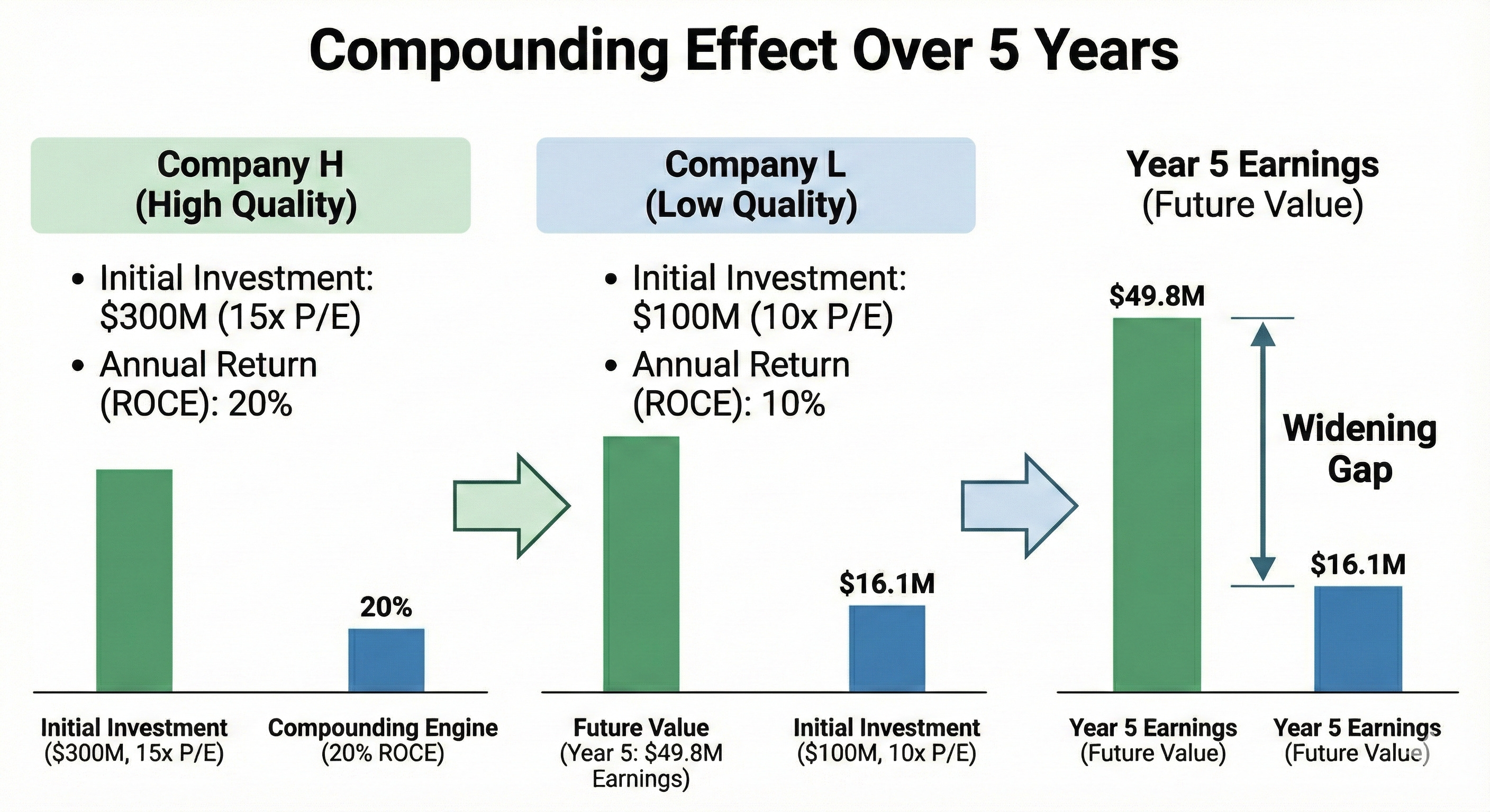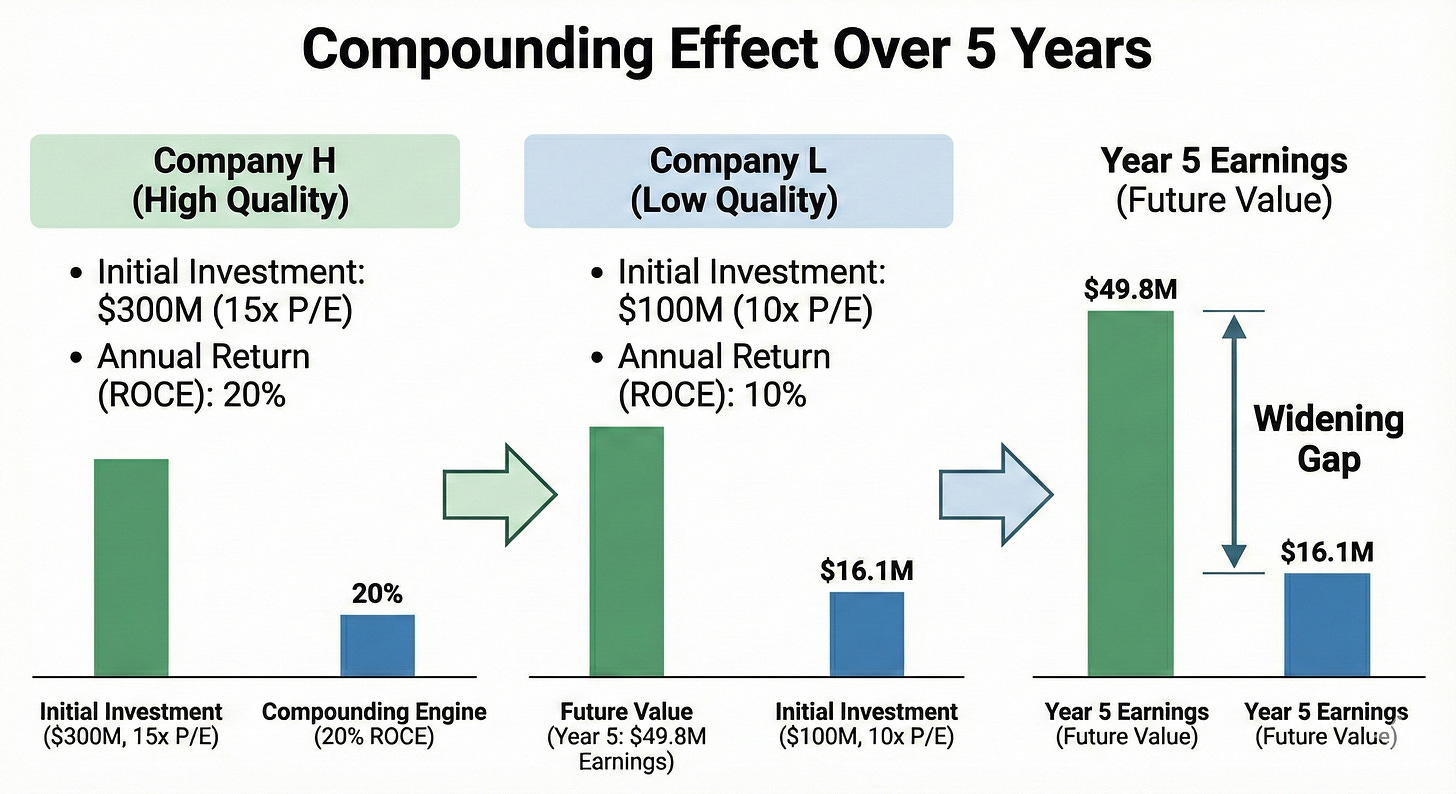 Even though Company H was 50% more expensive to start with, it became the cheaper stock in just 5 years because of how fast it compounded. If you focus only on a low starting P/E, you miss the magic.